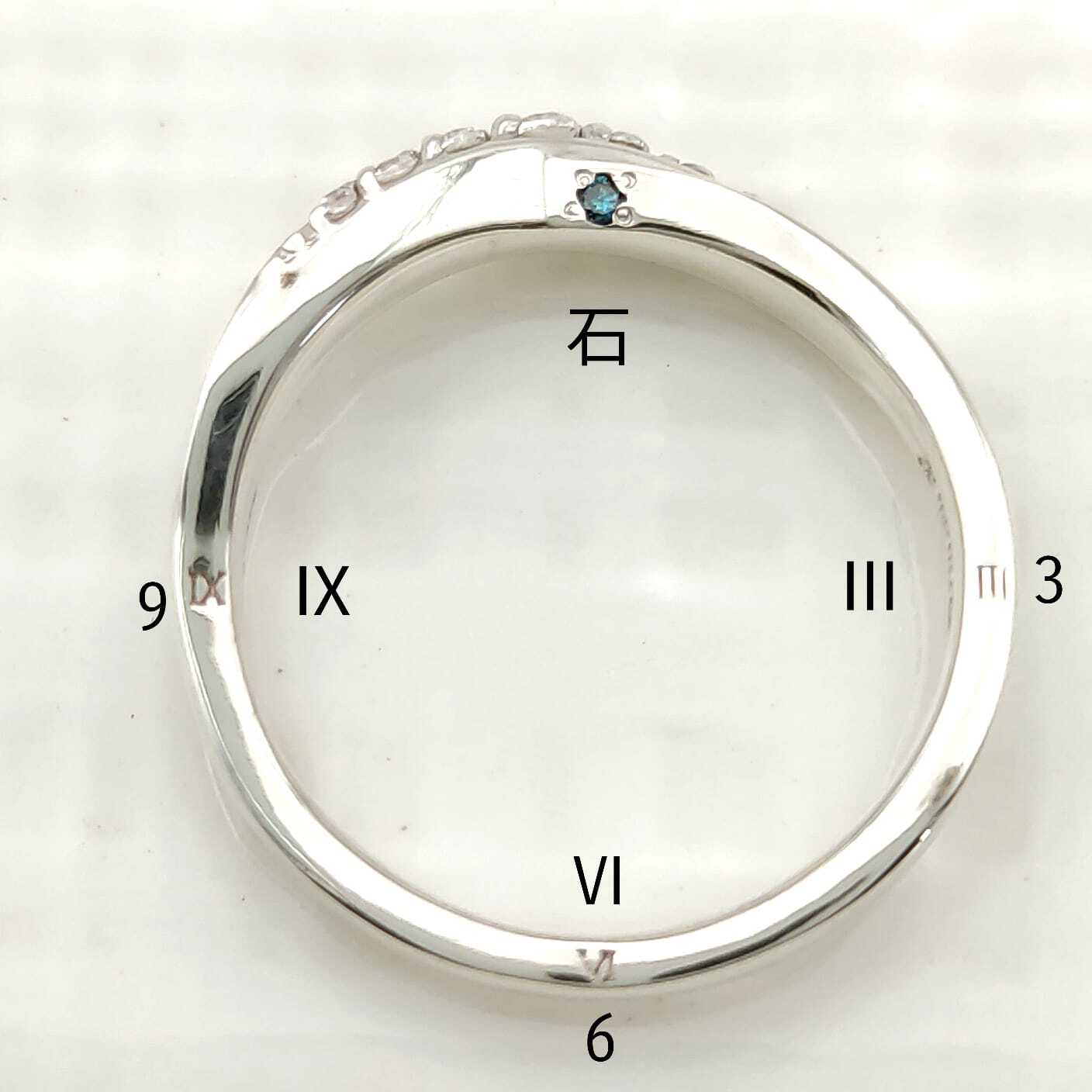 リングシェイプ(断面部分)片側に、時計のモチーフで12時部分に色石、3時、6時、9時部分にアラビア数字が刻まれています!